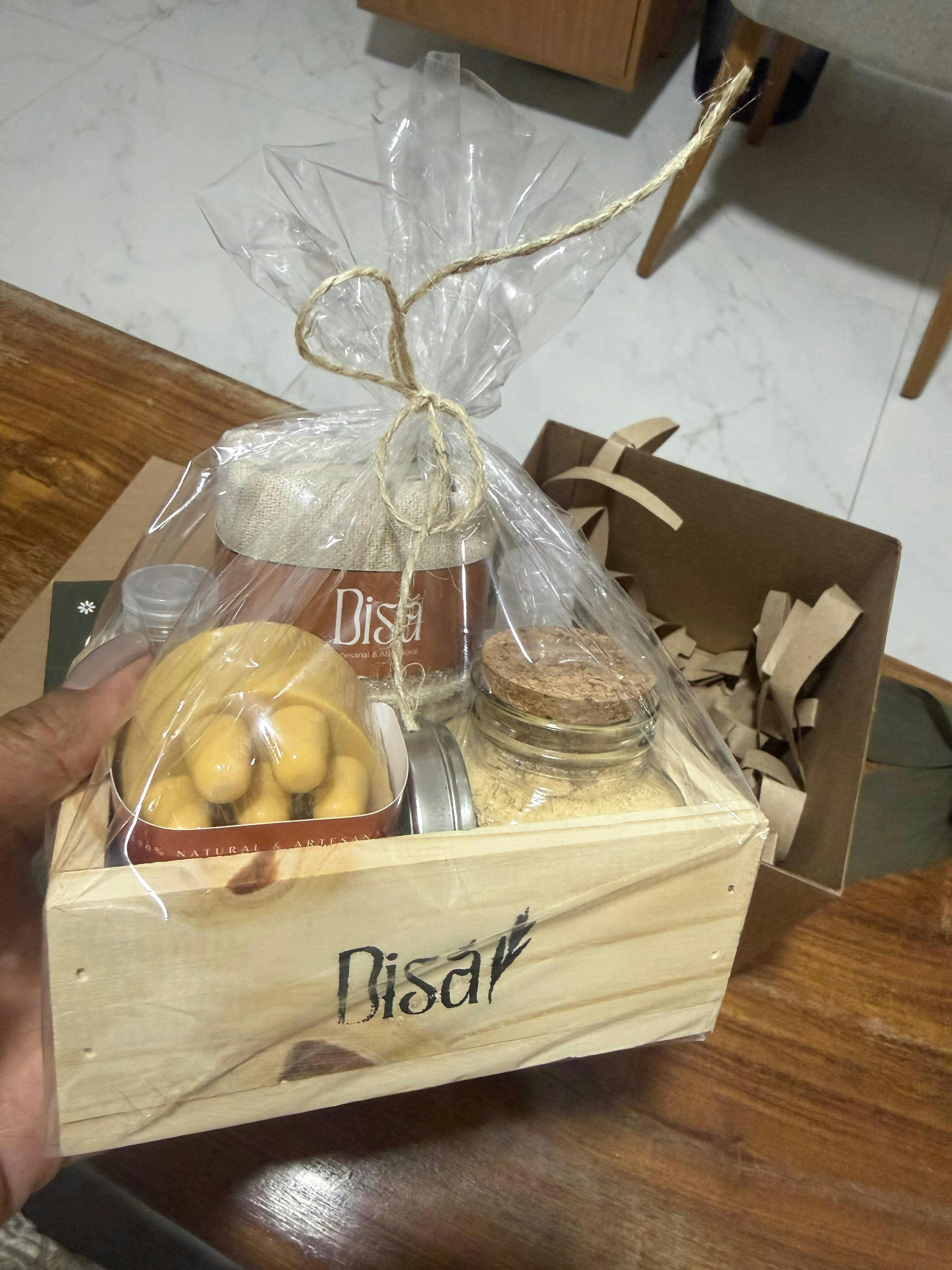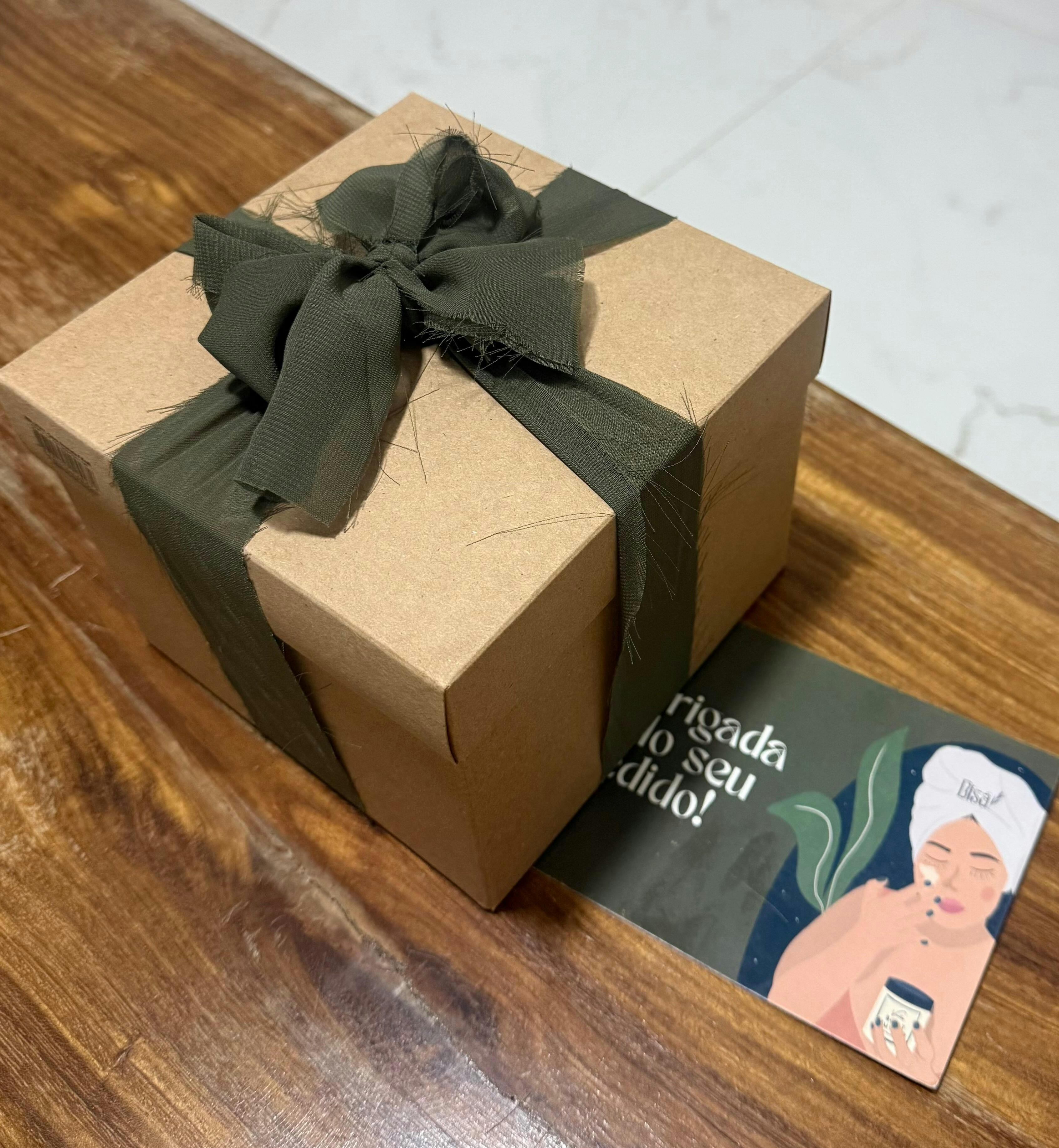 A apresentação também encanta: os produtos vêm em uma charmosa caixa de madeira pinus, envolta em celofane transparente e finalizada com uma caixa de papel cartão e fita chiffon verde — um presente com presença e propósito.